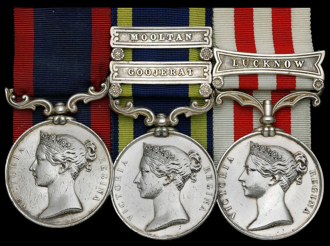 Sutlej 1845-46, for Sobaron 1846 (Geo: Peaugh 10th Regt); Punjab 1848-49, 2 clasps, Goojerat, Mooltan (Geo. Peaugh, 10th Foot); Indian Mutiny 1857-59, 1 clasp, Lucknow (G, Peaugh, 1st Batn 10th Regt), contact marks and heavy contact wear overall, nearly very fine (3)