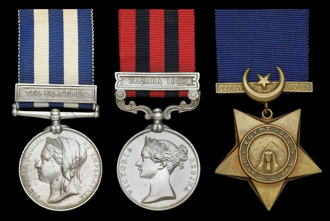 Egypt and Sudan 1882-89, dated reverse, 1 clasp, Tel-El-Kebir (2437, Pte. J. Collins, 2/R. Ir. R.); India General Service 1854-95, 1 clasp, Hazara 1888 (2437 Pte J. Collins 2d Bn R. Ir. R.); Khedive's Star 1882 contact marks from the star to the first, otherwise very fine