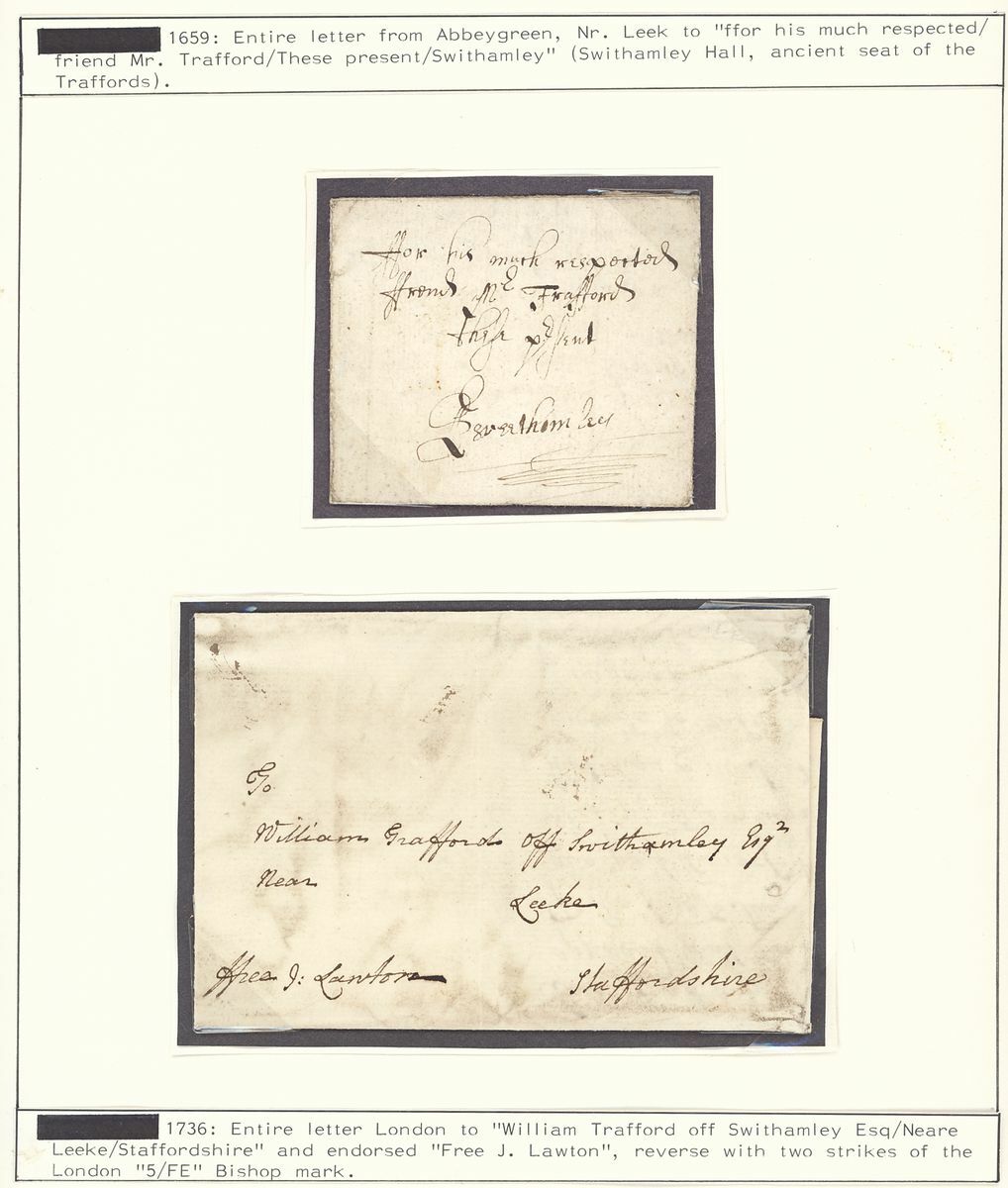 1659 (31 May) entire letter from Abbeygreen near Leak to "Mr. Trafford" at Swithamley together with 1736 (15 Feb.) entire letter from London to William Trafford marked "Free J: Lawton" and with London Bishop Marks on reverse; a fine duo.
