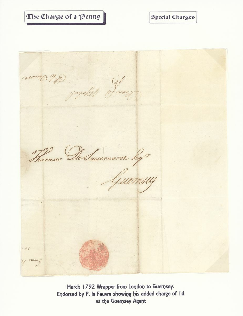 1792 (10 March) entire from London to Guernsey, endorsed on the reverse by P. le Fuevre and showing his added charge of 1d. as the Guernsey agent; filing folds, fine