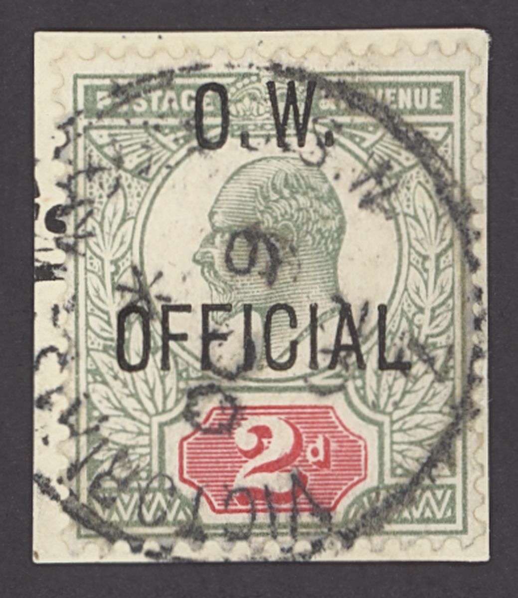 1902-03 2d. yellowish green and carmine-red tied to small piece of official stationery by part c.d.s. Fine. Wenvoe Certificate (2019). S.G. O38, £450+