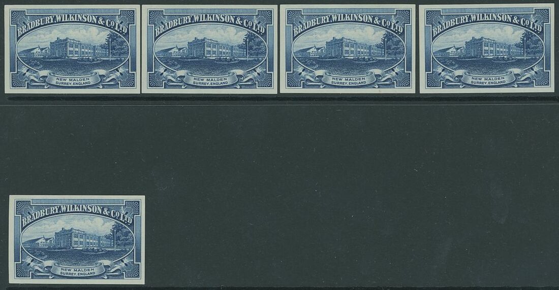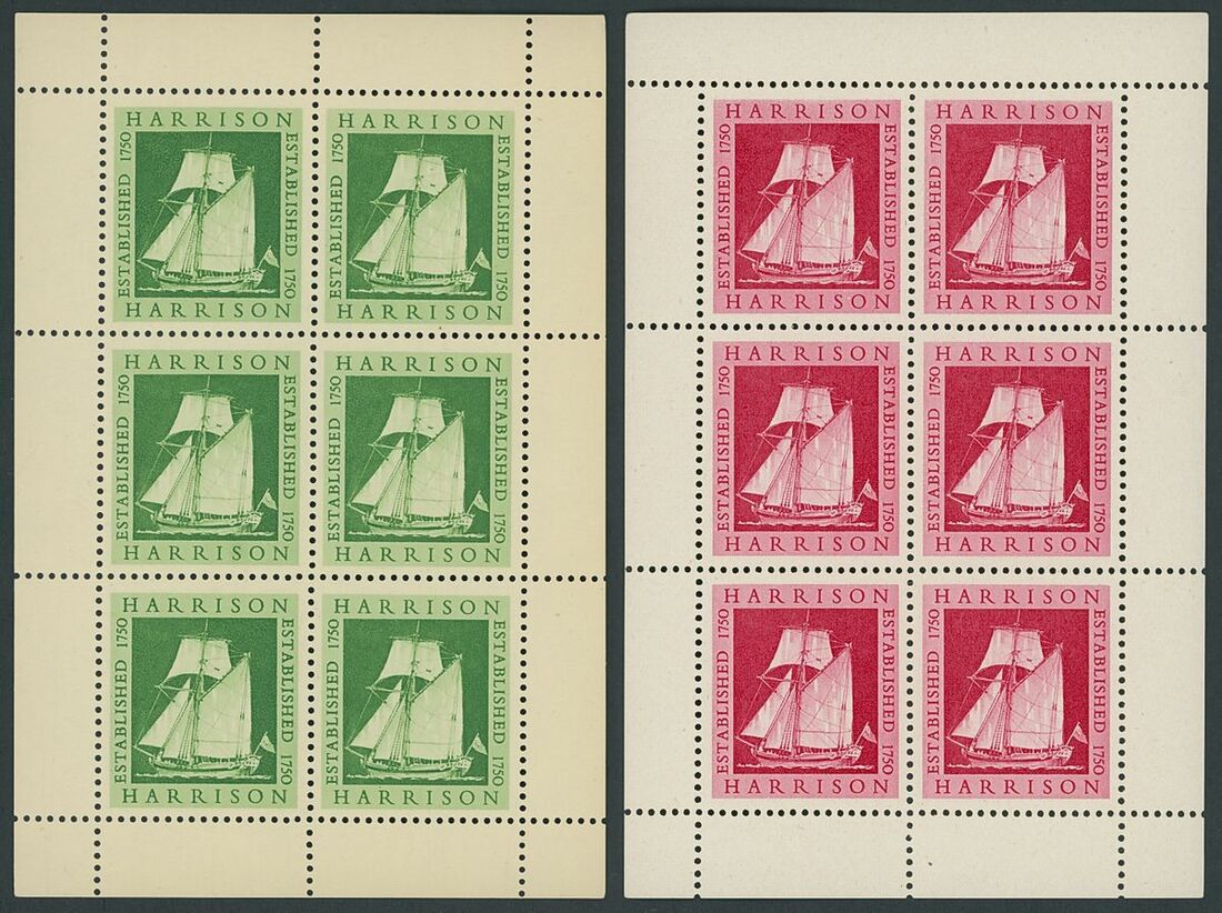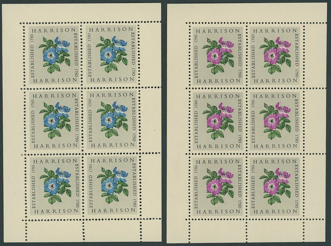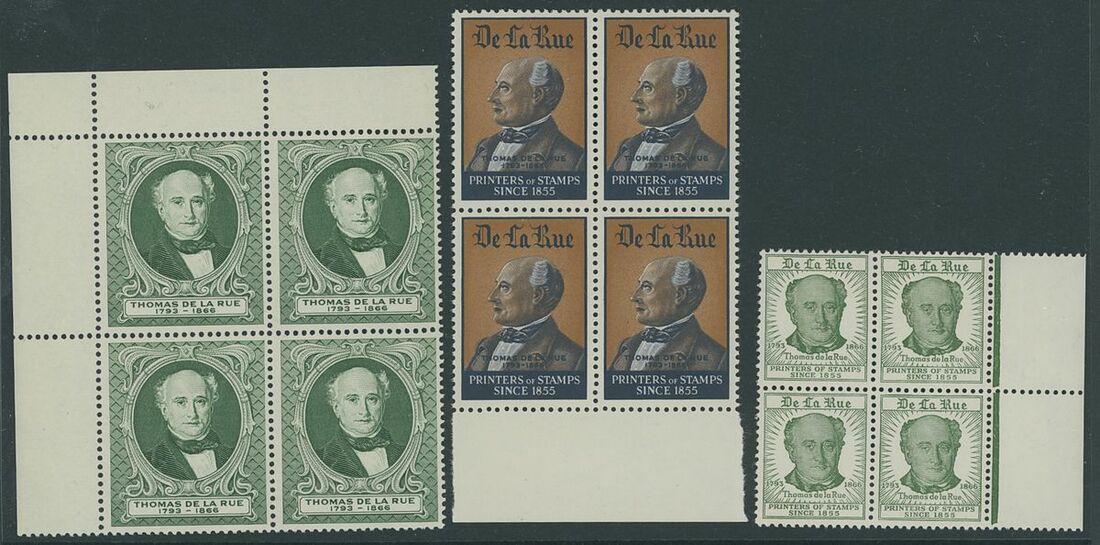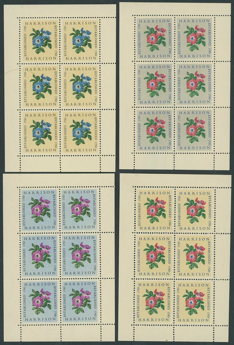 Selection of printers' samples including Harrison 'Established 1750' miniature sheets of six (40) with two different design (ships or flowers), Bradbury Wilkinson 'New Malden' building imperf. (5), De La Rue, 1793-1866 three different design in blocks of four, generally fine, an interesting lot for the specialist.