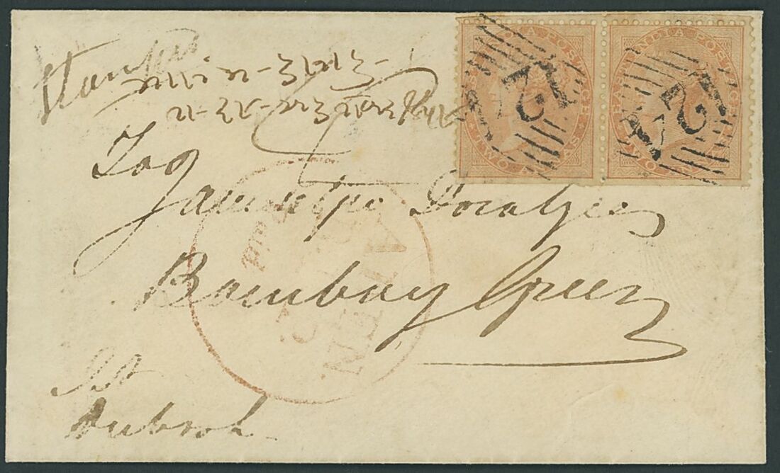1859 (21 Sep.) small size envelope (101x60mm) to Bombay bearing India 1856-64 2a. horizontal pair separated from the origin by scissor and with the lower side imperf, cancelled by "124" in diamond of bars cancellation with faint red
