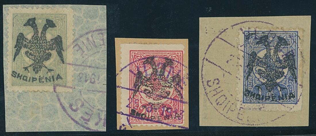 1913 Double Eagle overprint in black on Turkey 10pa. blue-green, 20pa. carmine-rose and 1pi. ultramarine, each cancelled on separate pieces (Vlone or Qukes), fine. Signed Dr. Peters