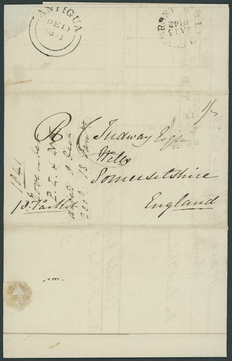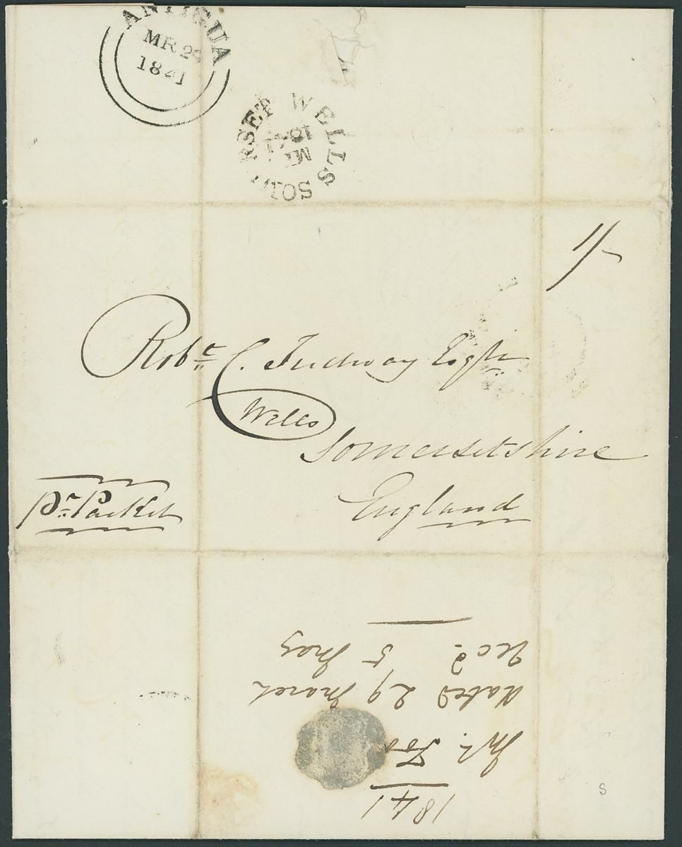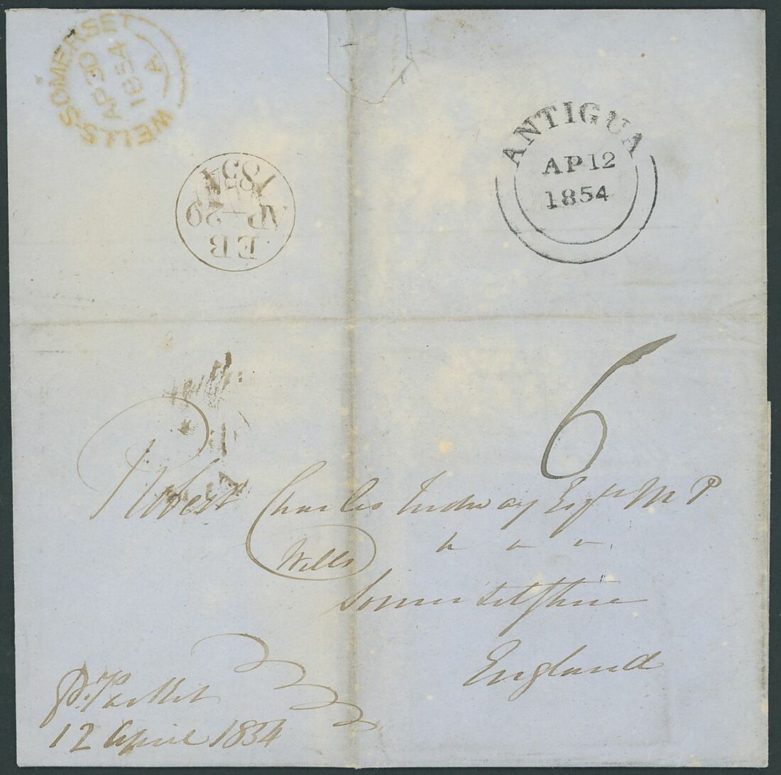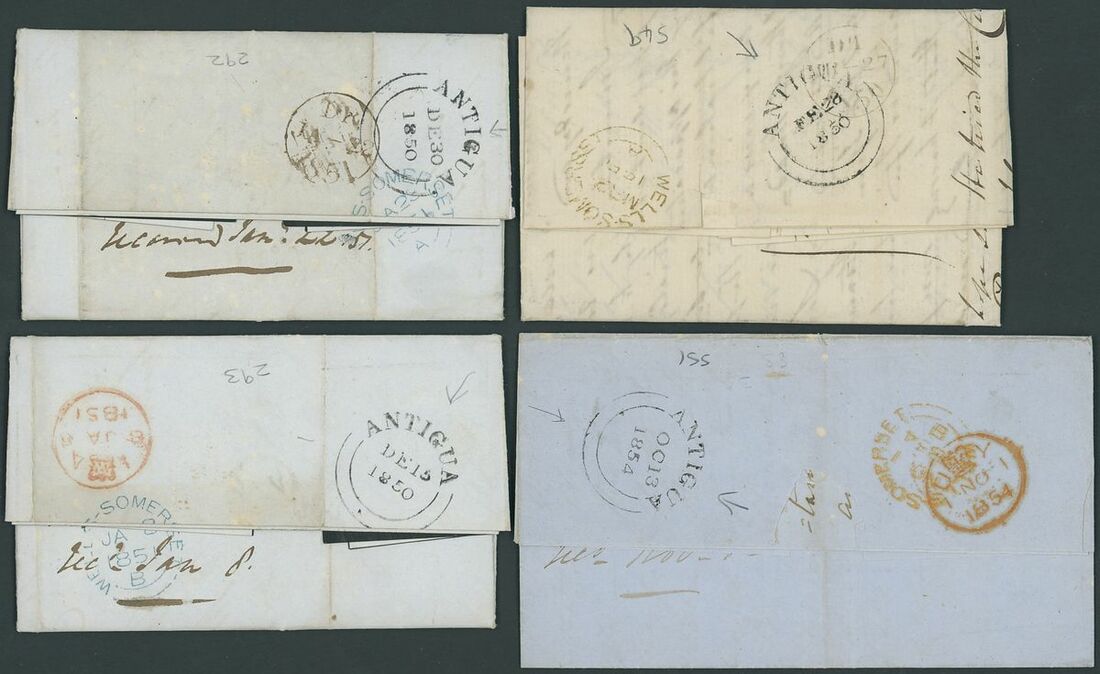 1841-54 entire letters (21) showing rates of "6" (4), "1/-" (10) and "2/-" (7), all showing Antigua double-arc d.s. on reverse, mostly average strikes but at least six fine to superb; condition generally fine