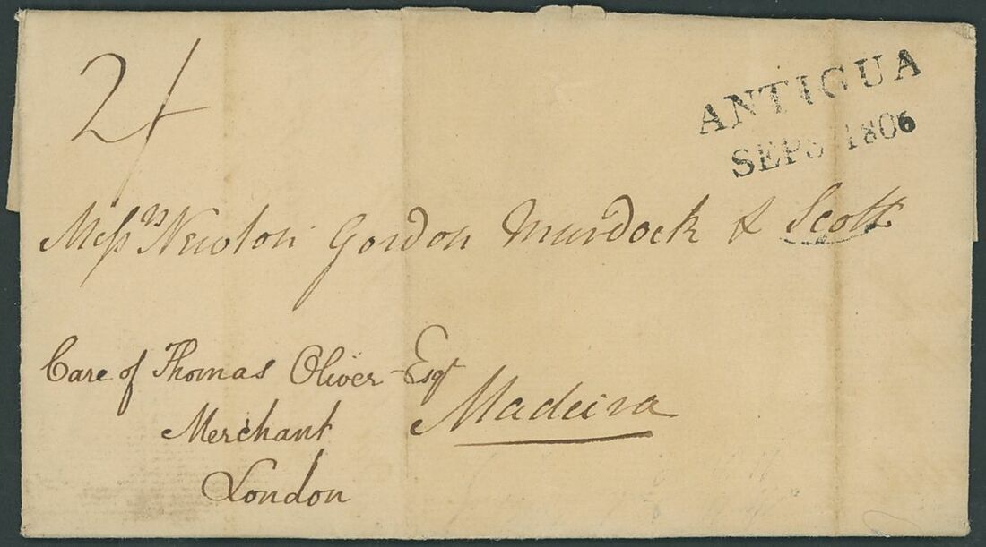1806 (25 Aug.) entire letter to Madeira, marked "Care of Thomas Oliver, Merchant, London", rated "2/1", showing mainly fine