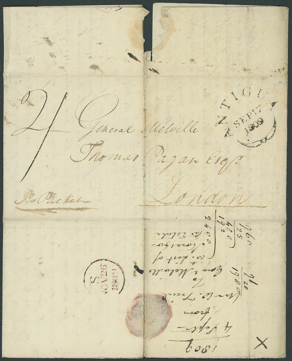 1809 (4 Sept.) entire letter from Dominica to London, marked "Per Packet", rated "2/-", showing fine large