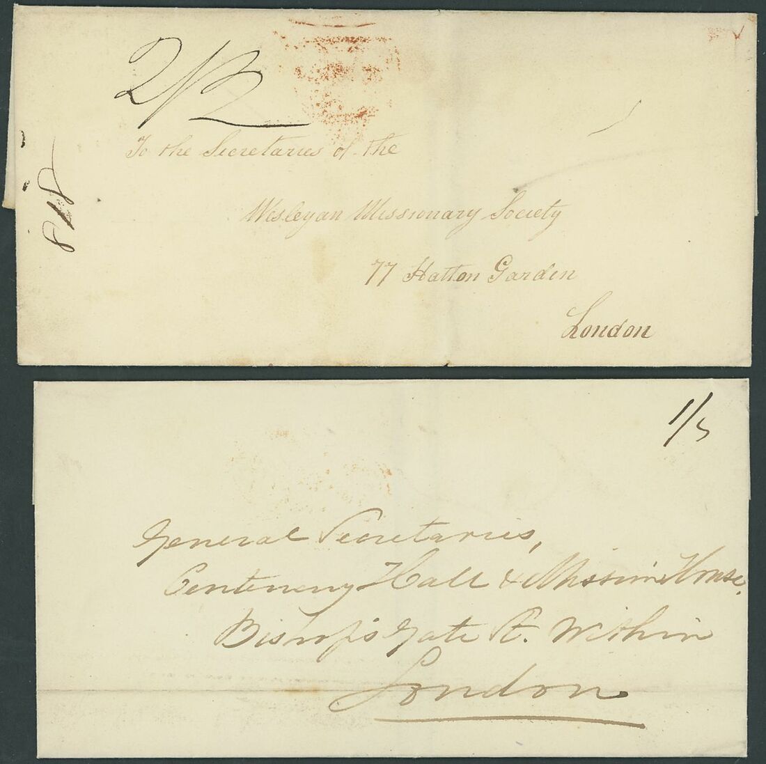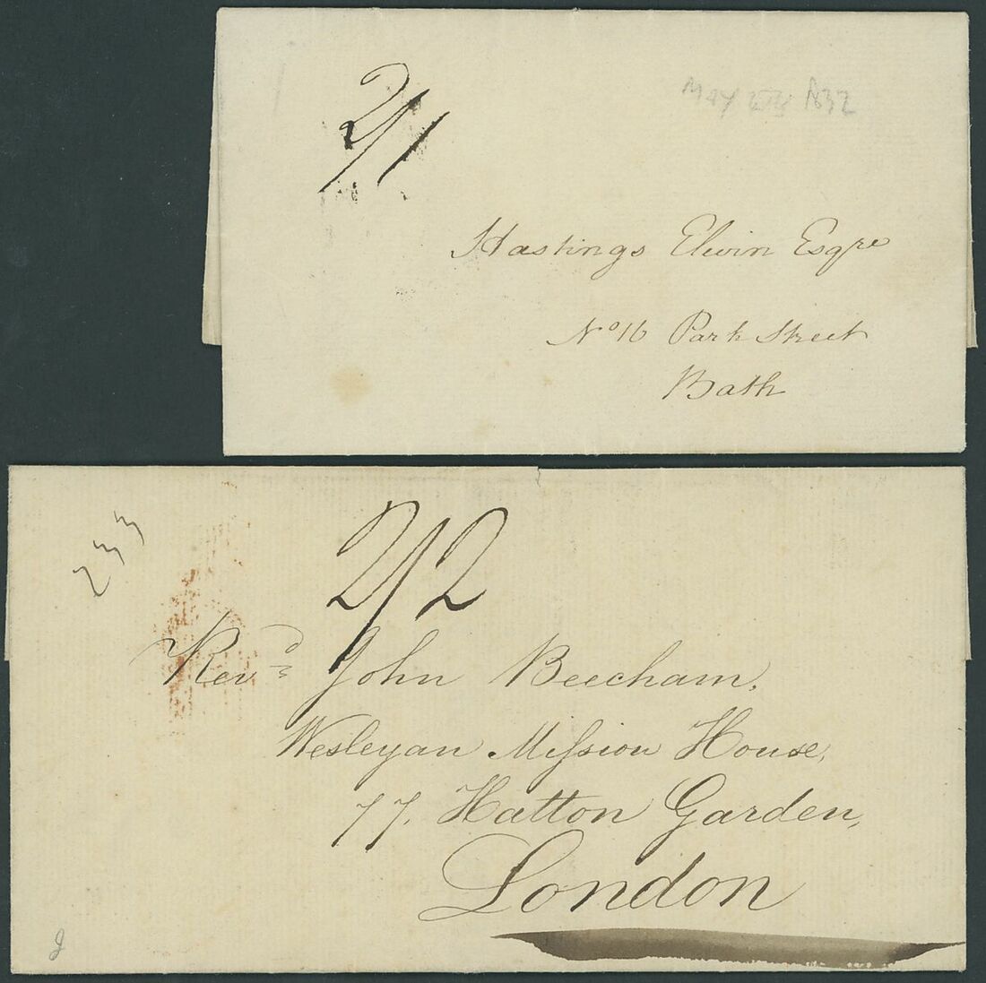 1825-40 entire letters (5) and entires (5) to Bath (2) and London (8), rated "2/1" or"2/2" and all showing, on reverse, small
