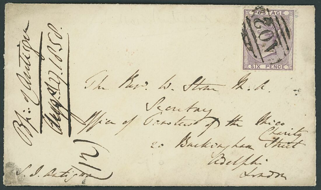1858 (28 Aug.) envelope to London, bearing 6d. lilac just tied by "A02" obliterator and showing, on reverse, despatch double-arc and red arrival (18.9) datestamps. R.P.S. Certificate (1990). S.G. Z5
