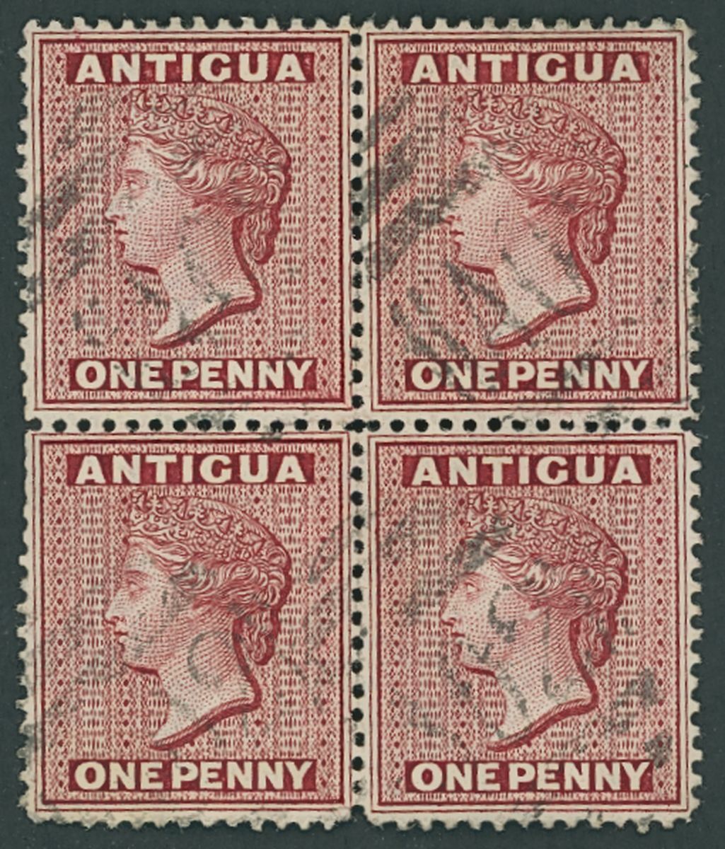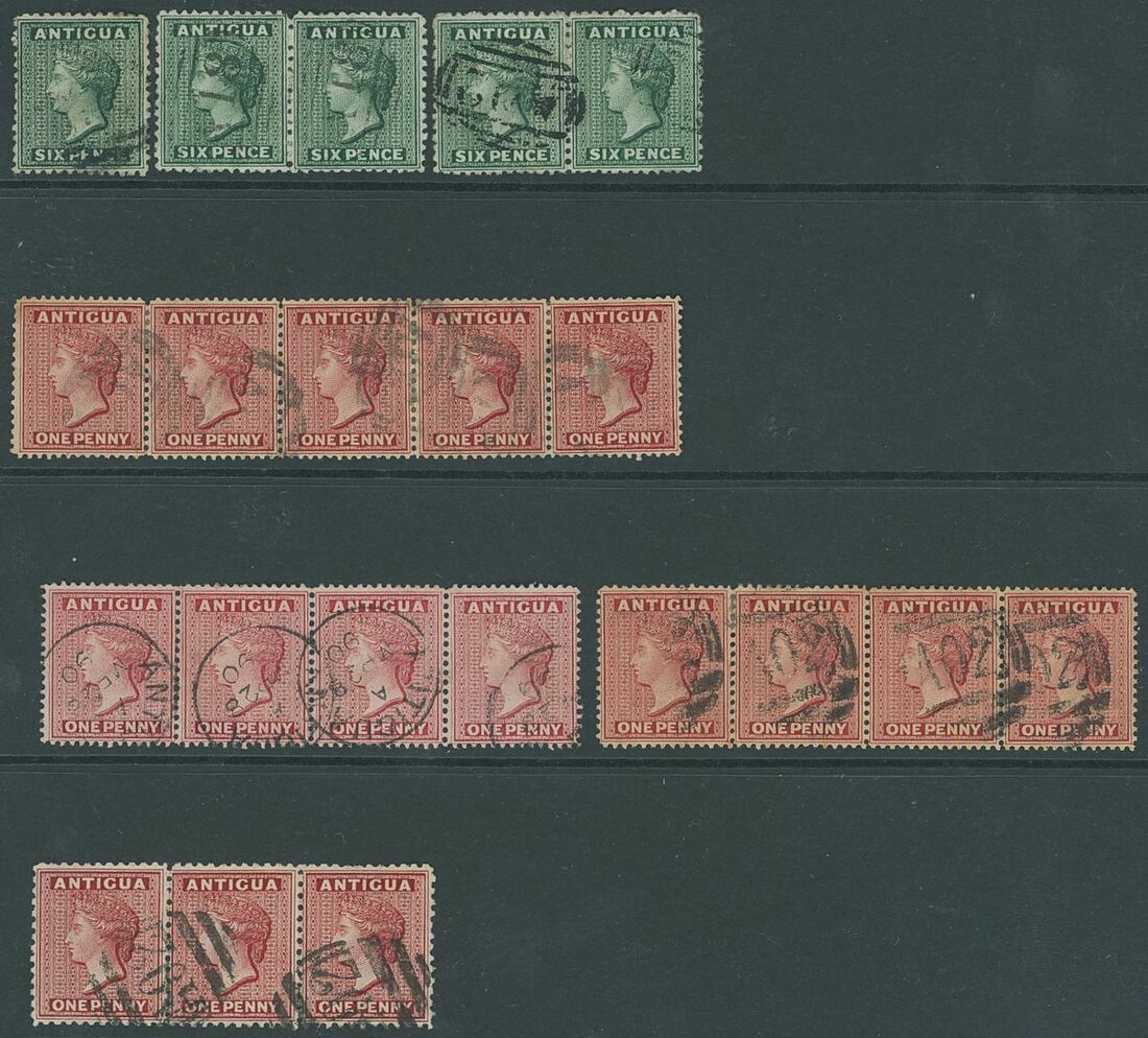 1872 CC, perf 12½ 6d. blue-green pairs (2) cancelled "A02" and "A18" plus a single with watermark reversed; 1876 CC, perf 14 1d. lake block of four cancelled "A02" and 1d. lake-rose strip of five cancelled "A18"; 1884 CC, perf 12 1d. carmine-red strip of three cancelled "A02"; and 1884-86 CA, perf 14 1d. carmine-red and 1d. rose strips of four cancelled "A02" and with c.d.s. respectively. Scarce multiples,  generally fine