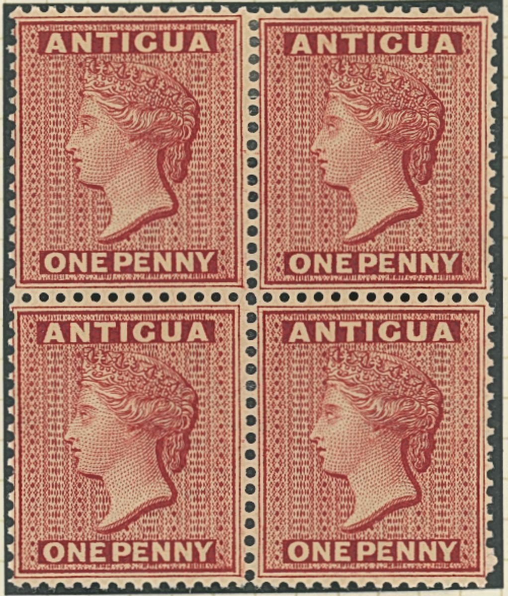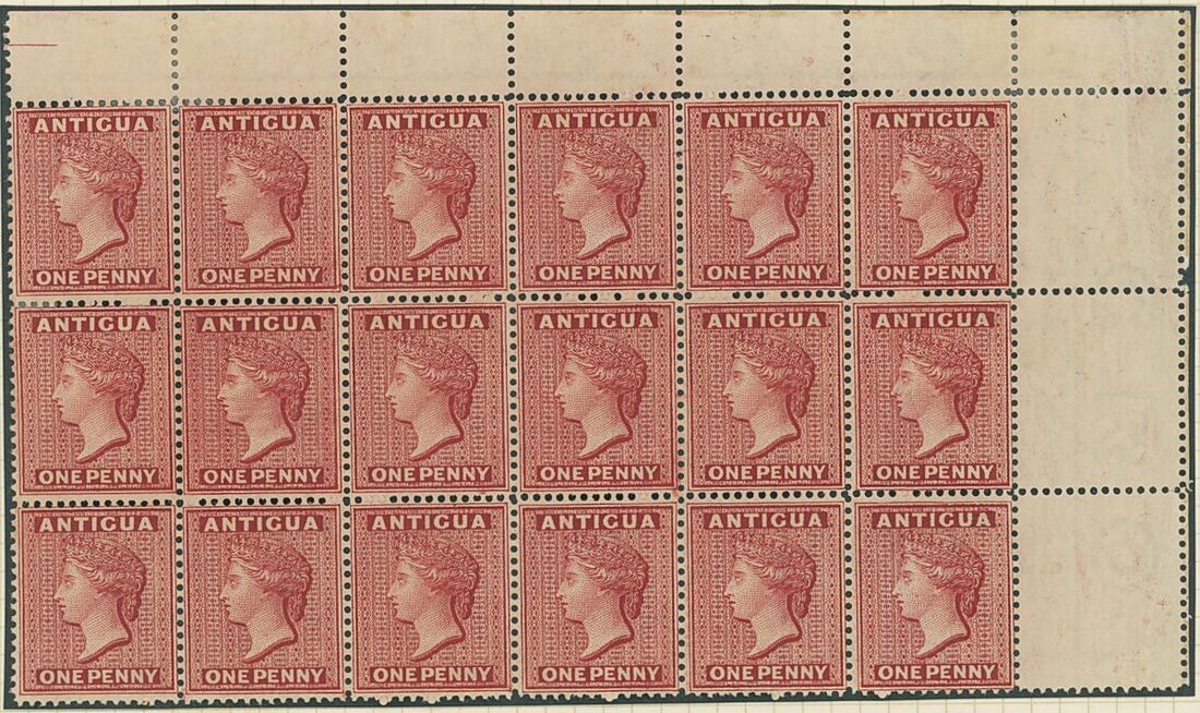 1884-86 CA, perf 14 1d. carmine-red, an upper right corner block of eighteen [6/36] showing re-entries on [8] and [20], and a mint block of four, fine. S.G. 25