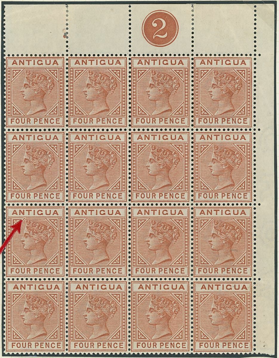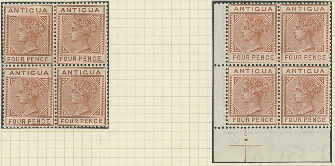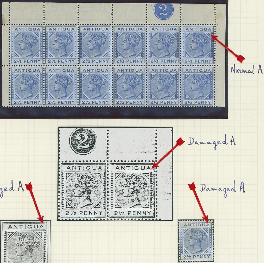 1884-86 CA, perf 14 2½d. ultramarine, a mint single (thin in lower left corner) showing variety damaged second "A" together with a mint top right corner block of twelve (6x2) from the right pane of Plate 2 showing "A" normal; and 4d. chestnut upper right corner block of sixteen (4x4) from Plate 2, [15] showing top left triangle detached, and two mint blocks of four, one from the lower left corner; fine