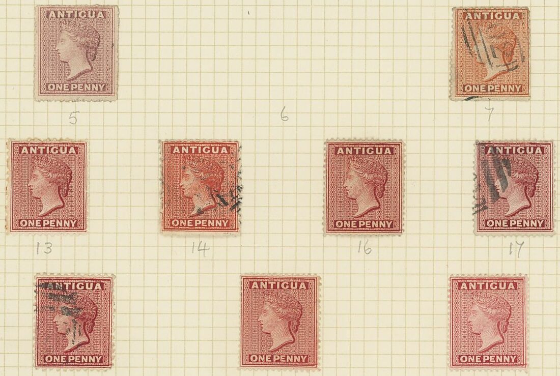 [8]: 1863-67 rosy mauve (mint) and vermilion; 1872 lake (mint) and scarlet; 1876 lake (mint) and lake-rose; 1884 carmine-red; 1884-86 carmine-red (mint) and rose (mint). (9)