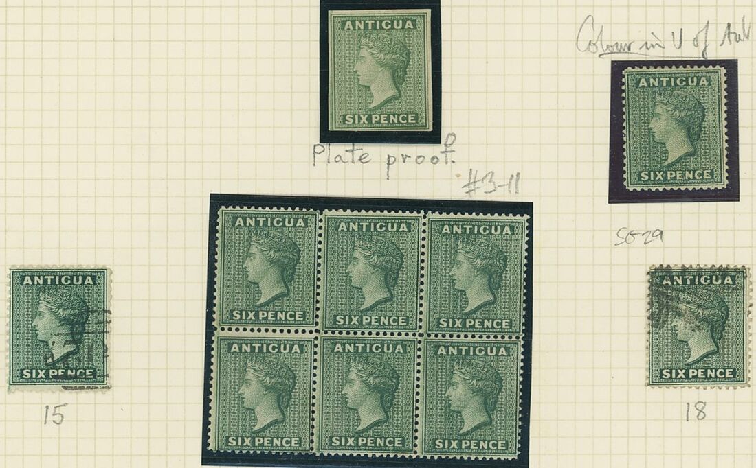 [118]: Plate proof in green; 1872 blue-green; 1876 blue-green; 1884 deep green (2 mint, on in a block of six). (10)