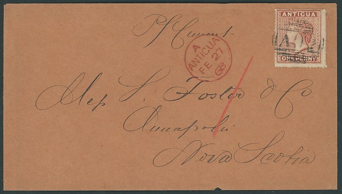 1868 (27 Feb.) brown envelope to Nova Scotia, bearing 1863-67 1d. vermilion tied by "A02" obliterator, showing red crayon "1" with superb despatch c.d.s. in red alongside and, on reverse, St. Thomas transit datestamp (29.2)