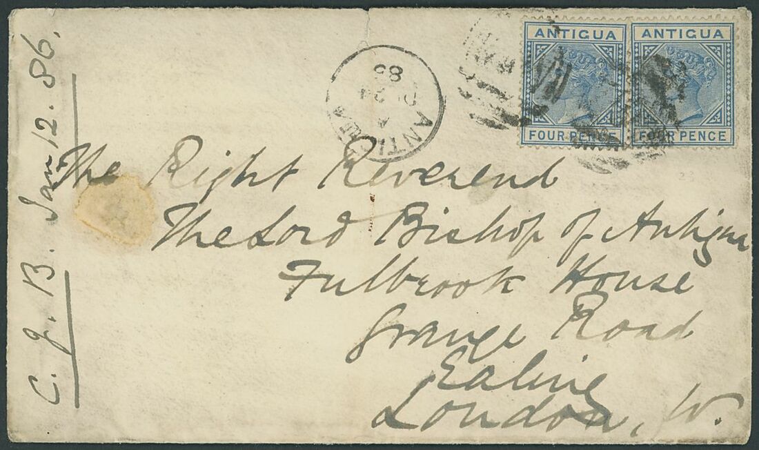 1885 (24 Dec.) double rate envelope to London, bearing 1882 4d. blue (2) tied by "A02" obliterator and showing despatch c.d.s. alongside with arrival datestamp (11.1) on reverse; the envelope a little soiled and with flap missing