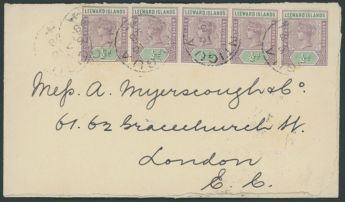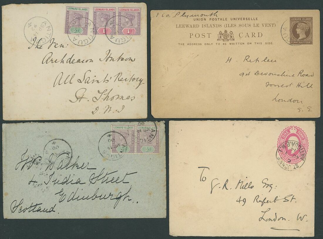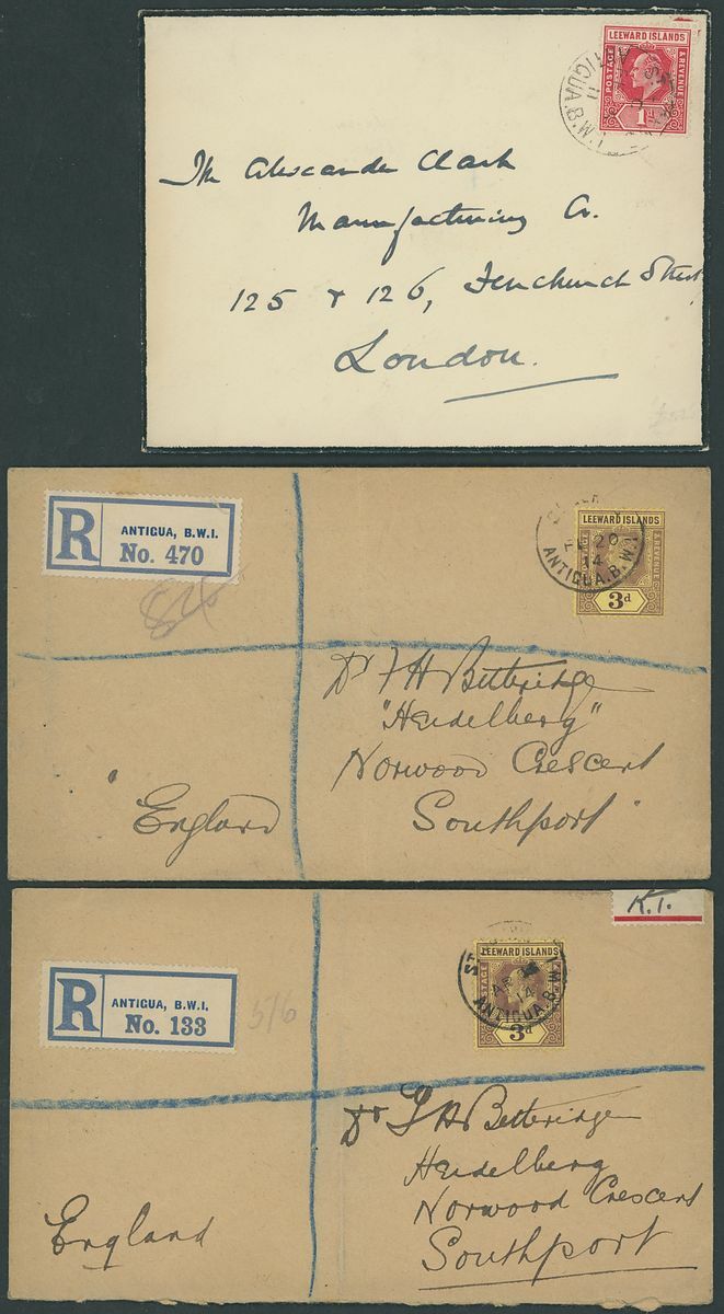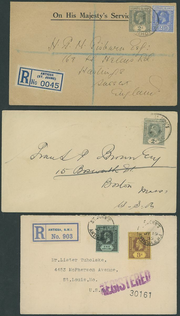 1892-1942 envelopes (11, four registered) and Leeward Islands stationery card, envelopes (4) and registered, variously addressed and franked with Leeward Islands adhesives including 1892 (14 Sept.) to St. Thomas bearing 1890 ½d. and 1d. pair; and 1898 (16 Mar.) Myerscough envelope to London bearing 1890 ½d. (5). A good lot