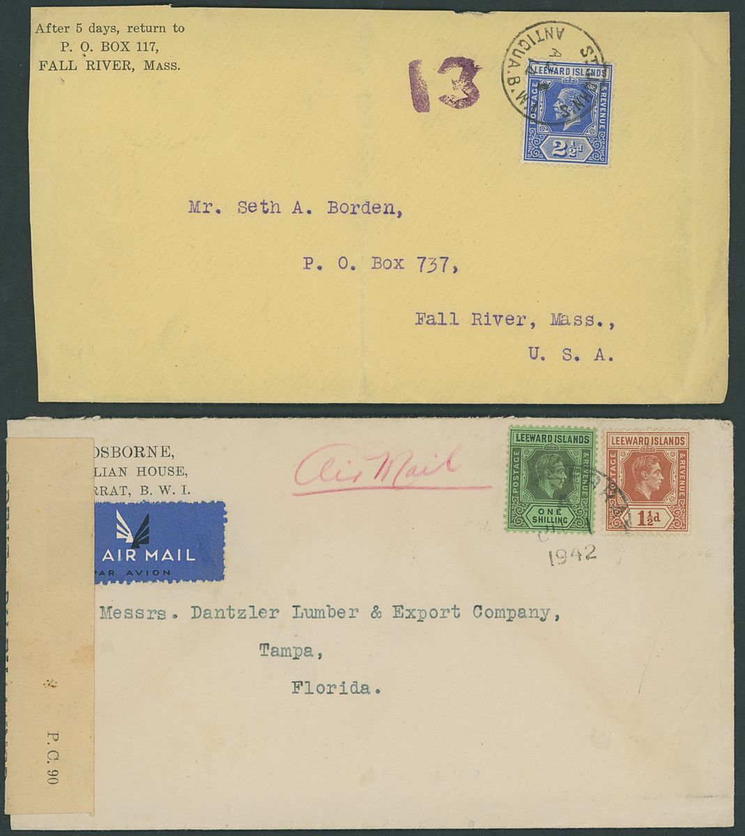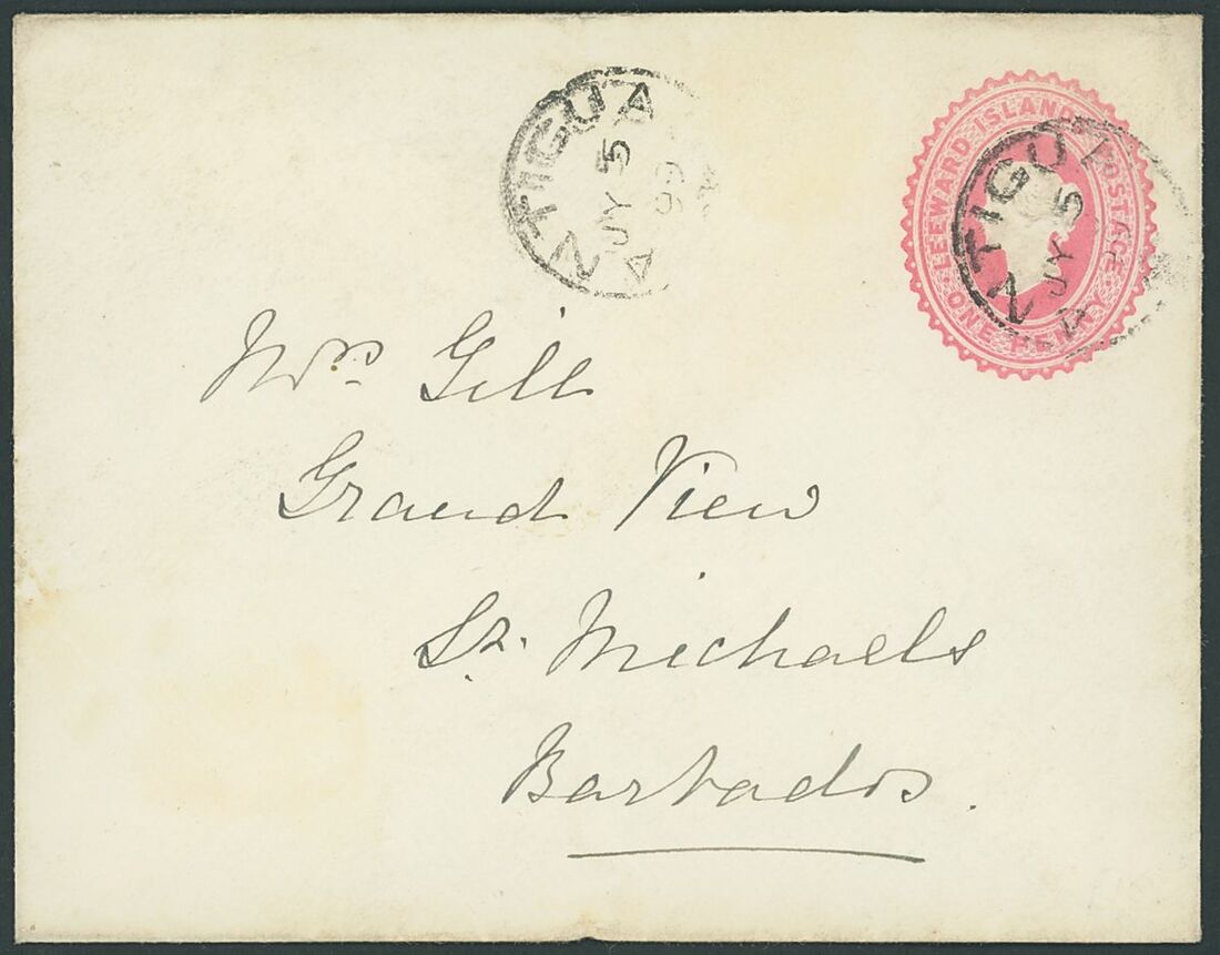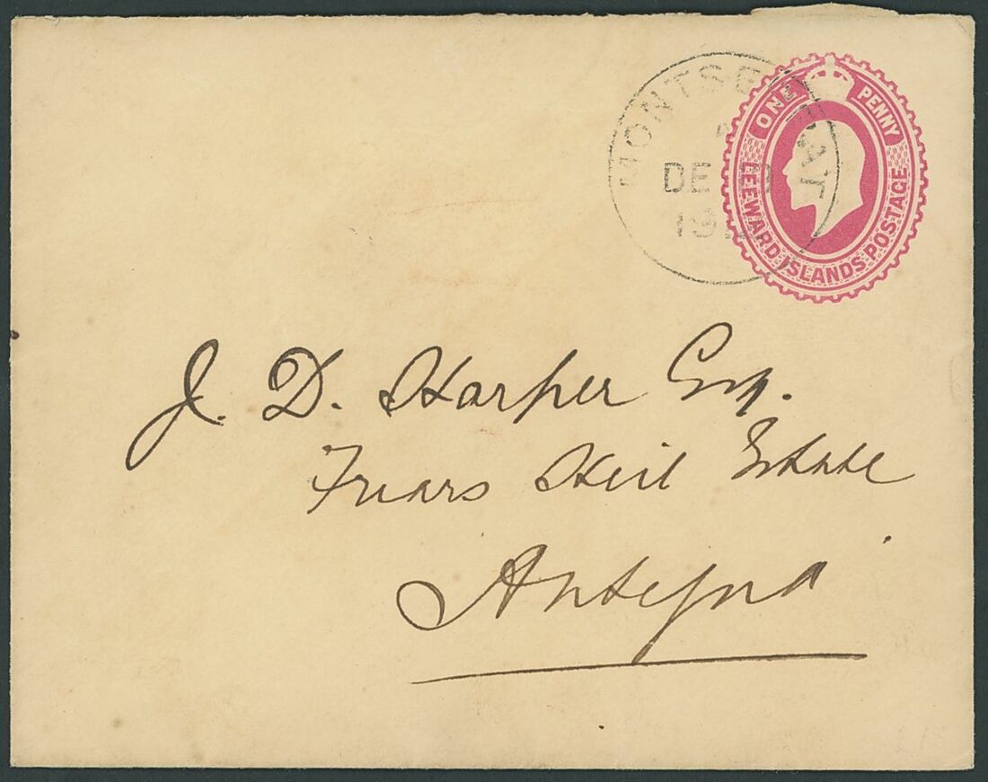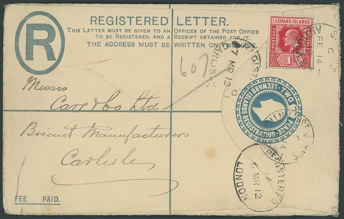 1892-1942 envelopes (11, four registered) and Leeward Islands stationery card, envelopes (4) and registered, variously addressed and franked with Leeward Islands adhesives including 1892 (14 Sept.) to St. Thomas bearing 1890 ½d. and 1d. pair; and 1898 (16 Mar.) Myerscough envelope to London bearing 1890 ½d. (5). A good lot