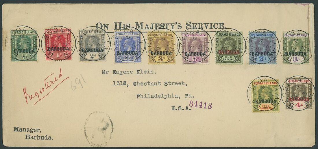 1922 (4 Sept.) OHMS envelope (230x105mm) registered to Philadelphia, bearing 1922 ½d. to 5/- set of eleven, each tied by