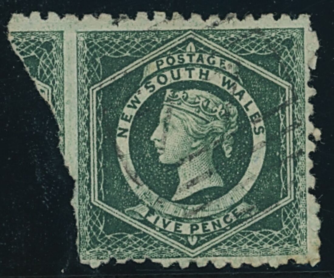 1882-85 Diadem, perf 10 5d. deep dull green with watermark inverted, variety imperforate at left between portion of adjoining stamp, lightly cancelled "77", fine. Possibly unique. Ceremuga Certificate (2016). S.G. 231 var. Photo