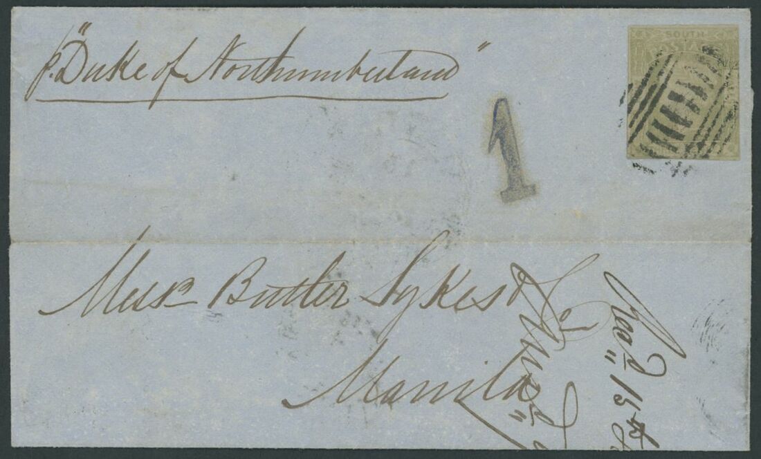 1854 (21 Nov.) entire from Sydney to Manila, marked "p. Duke of Northumberland", bearing Sydney View 3d. (touched at upper right) clearly tied by dumb obliterator, showing handstruck "1" (reales) with, on reverse, despatch and arrival datestamps; the 3d. crossed by light horizontal filing crease at top and the face panel with part recipient's notation at lower left