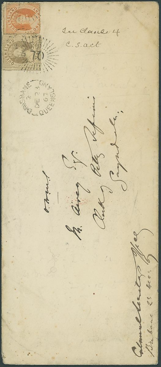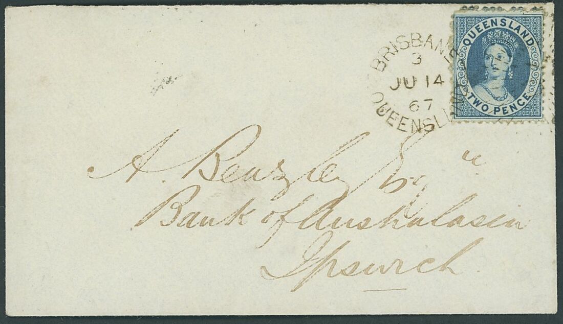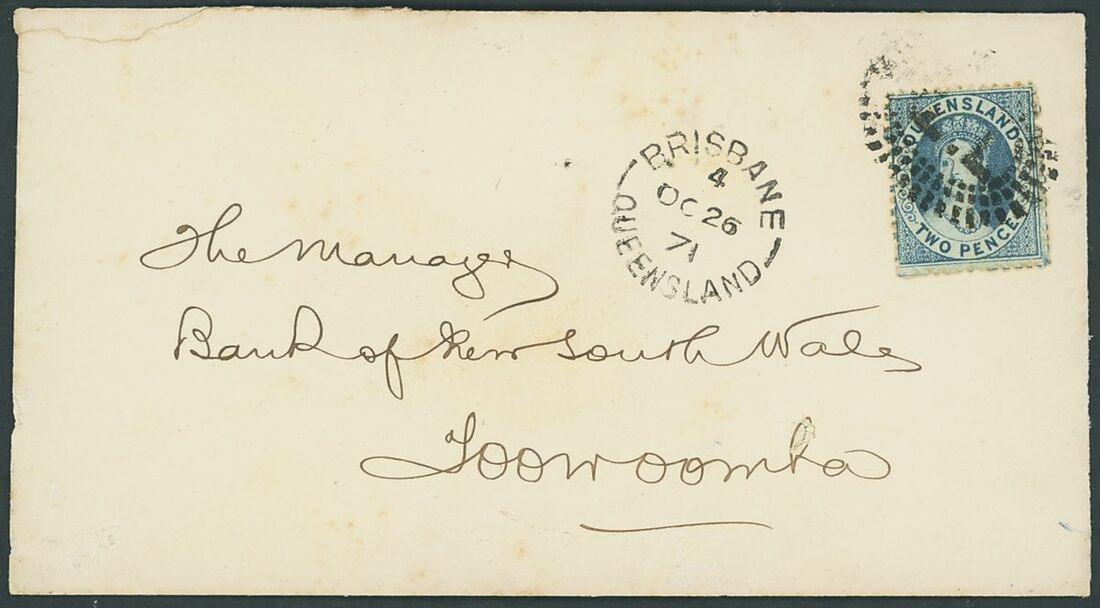 1867 (14 July) and 1871 (26 (Oct.) envelopes (the latter spiked) from Brisbane to Ipswich and Toowoomba, both bearing 2d. tied by