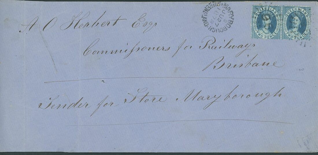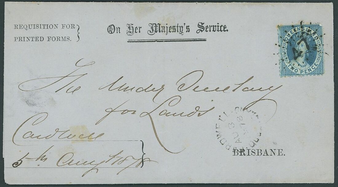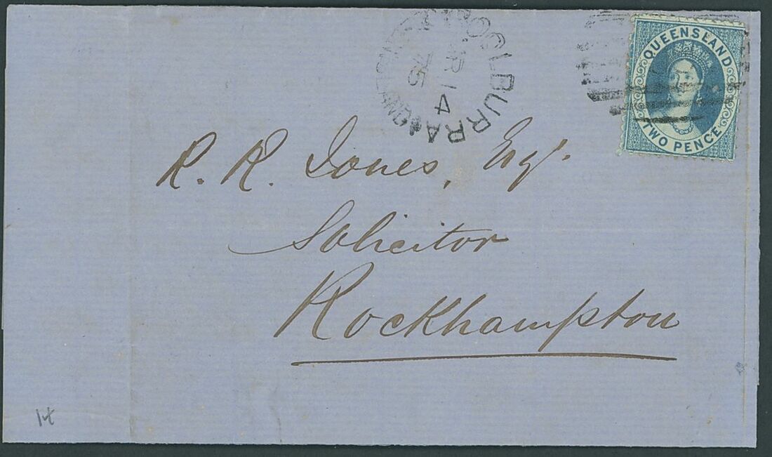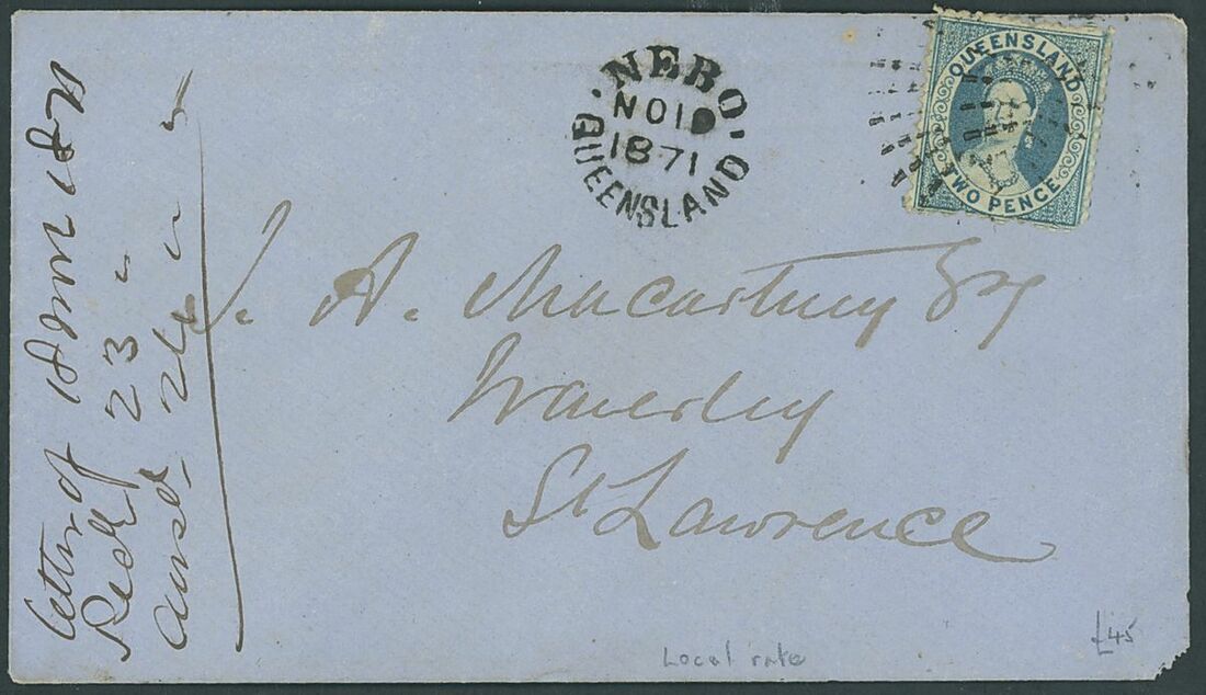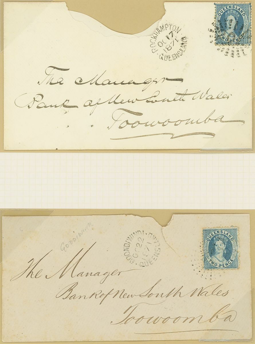 1871-78 entire and envelopes (6) from Boolburra, Cardwell, Goondiwindi, Maryborough (2), Nebo and Rockhampton, all bearing 2d.; two envelopes with some damage otherwise generally fine