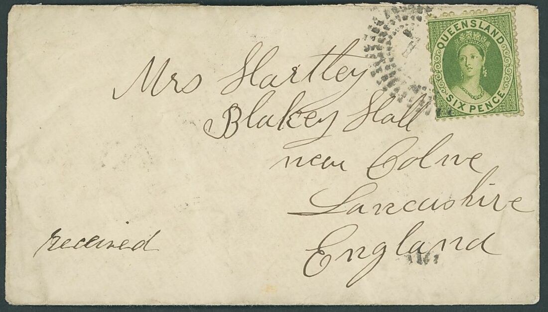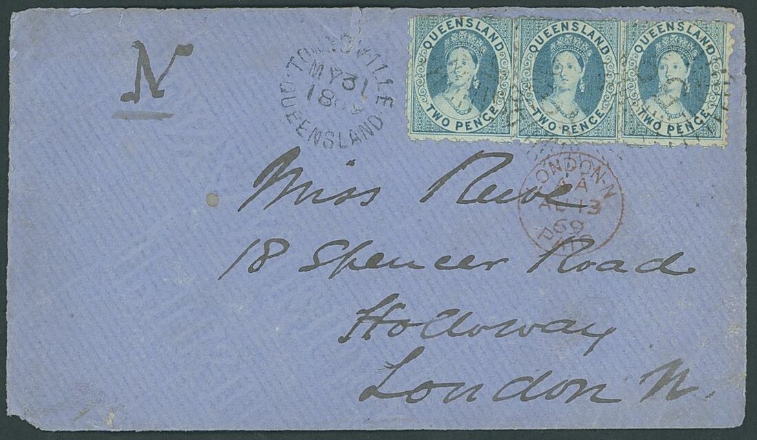1869 (31 May) blue envelope (parts of flap torn away) from Townsville to London, bearing rough perf 13 2d. blue (3) tied by light "59" sunburst with despatch and arrival (13.8) datestamps alongside; and 1869 (14 June) envelope from Brisbane to Lancashire, bearing perf 13 6d.yellow-green tied by