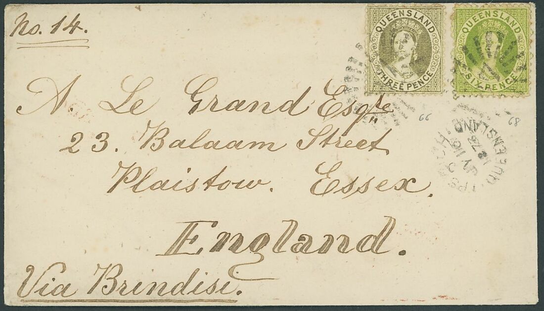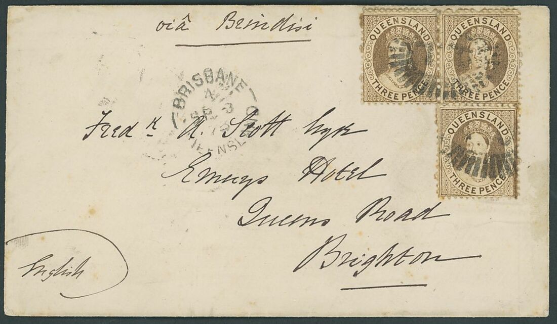 1873 (16 July) envelope from Ipswich to Essex, marked "Via Brindisi", bearing 3d. olive-brown and 6d. yellow-green, both tied by "87" sunburst with despatch c.d.s. alongside and showing, on reverse, Brisbane (19.7) and London (30.9) datestamps; and 1873 (3 Sept.) envelope from Brisbane to Brighton, marked "Via Brindisi", bearing 3d. brown pair and single cancelled by