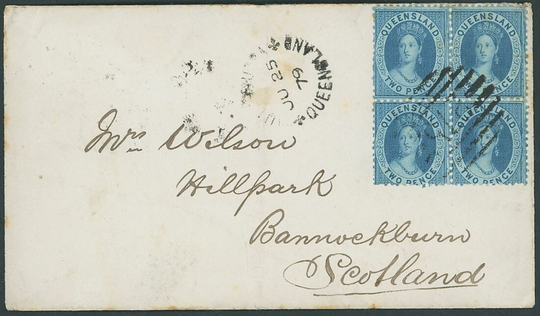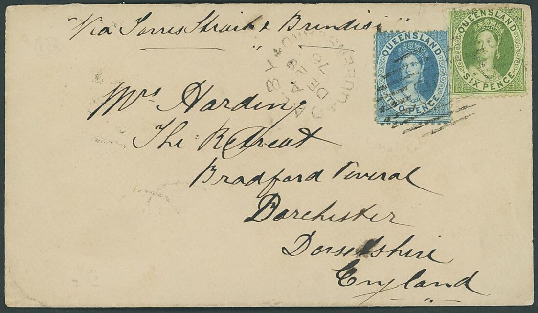 1876 (29 Dec.) envelope from Dalby to Dorchester, marked "Via Torres Straits & Brindisi", bearing 2d. blue and 6d. yellow-green cancelled by "96" in bars, showing despatch c.d.s. alongside with Brisbane transit datestamp on reverse; and 1879 (25 June) envelope from Muttaburra to Scotland, bearing 2d. blue block of four cancelled by "275" in bars with despatch c.d.s. alongside and Rockhampton, Brisbane and arrival datestamps on reverse
