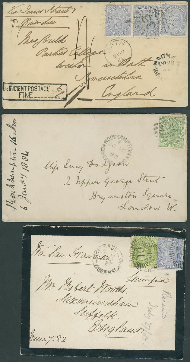 1882 (17 May) envelope from Mackay to Bath, marked "Via Torres Straits & Brindisi", bearing Sideface 2d. (3) tied by "33" sunburst, showing despatch and arrival datestamps, manuscript "1/-" and framed