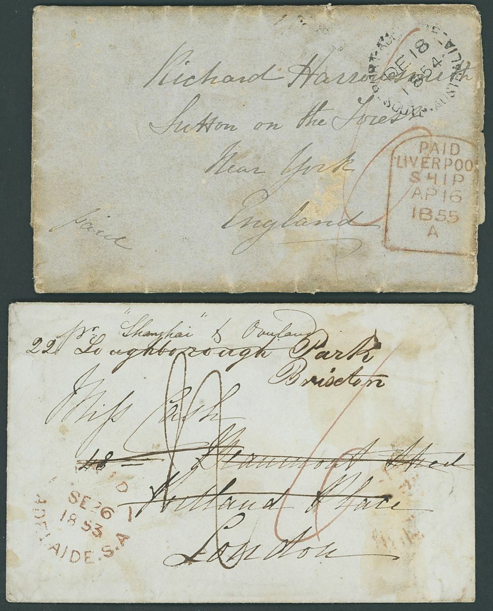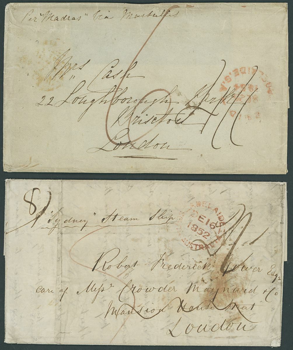 1852 (16 Dec.) entire letter from Adelaide to London, marked "Sydney Steam Ship", rated "2/-" and showing
