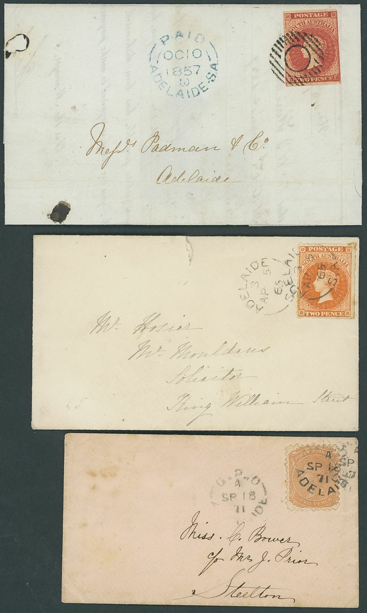 1857 (10 Oct.) front and part back, bearing 1856 Adelaide 2d. red crisply tied by void obliterator and showing