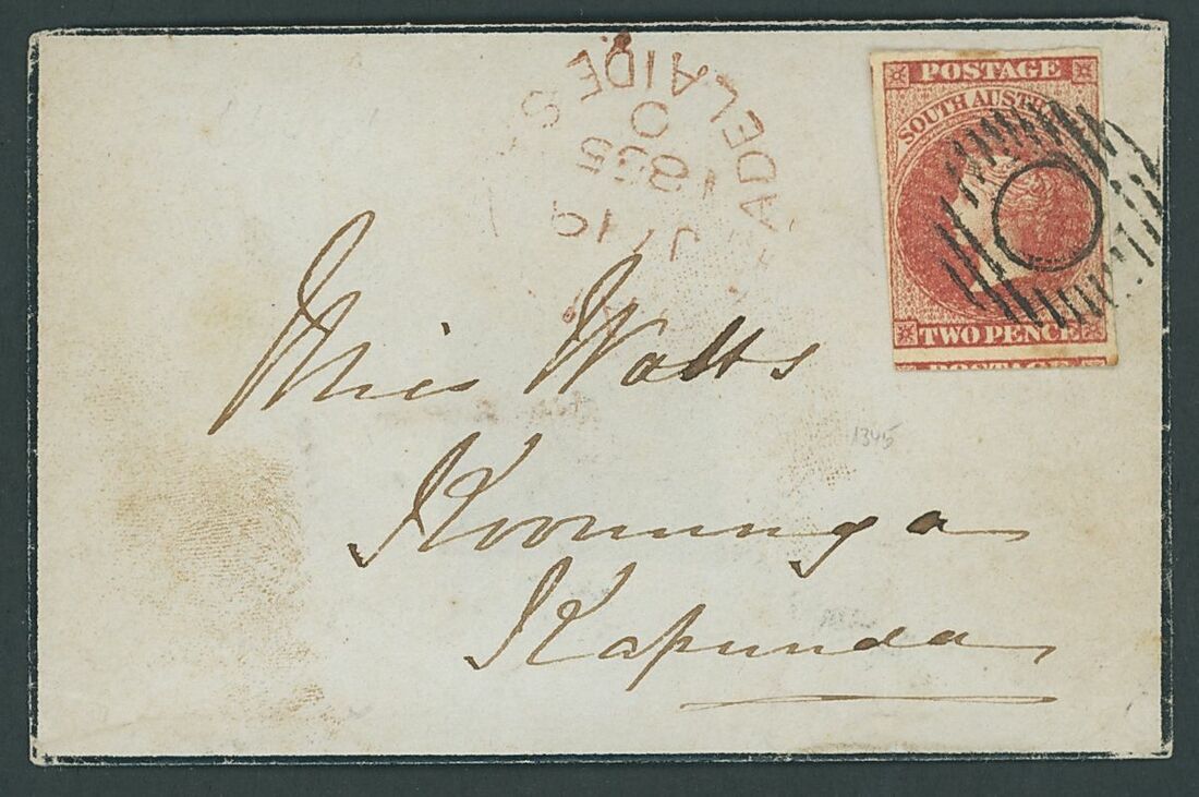 1855 (19 Jan.) small mourning envelope to Kapunda bearing 1855 2d. rose-carmine with close to large margins with portion of stamp below, neatly tied by dumb obliterator, showing