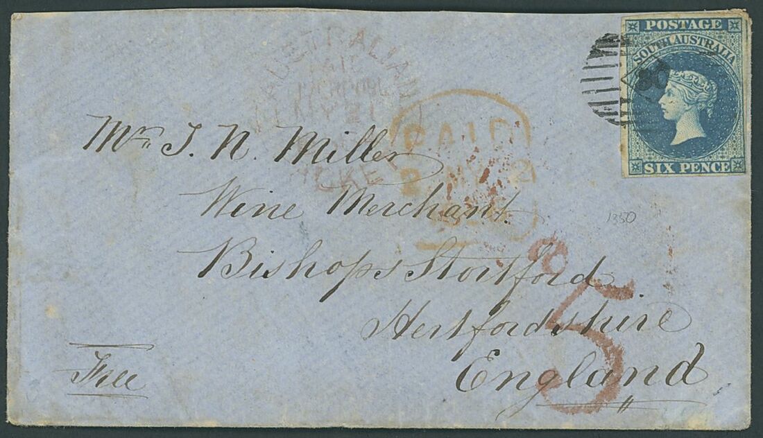 1855 envelope to Bishops Stortford, bearing 1855 6d. deep blue with close to good margins and clearly tied by "30" obliterator, showing "d5" accountancy h.s.,, light