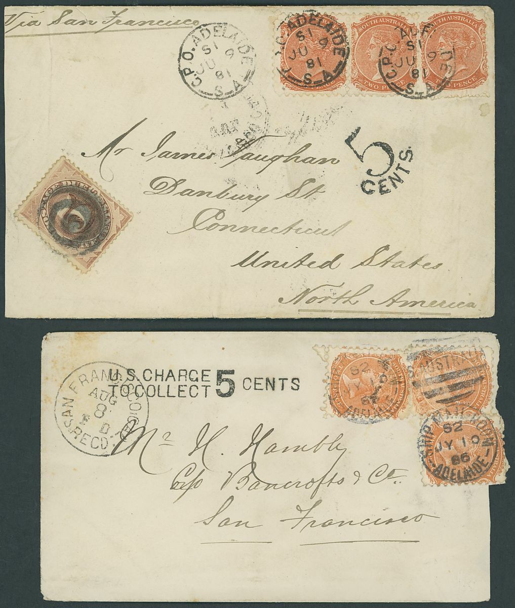 1881 (9 June) envelope to Connecticut, marked "Via San Francisco", bearing Sideface 2d. (3) tied by Adelaide c.d.s., showing