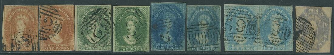 1857-67 watermark double-lined numeral, 1d. pale red-brown (2, one with watermark inverted, the other with tip of top right corner repaired), 2d. green, 2d. deep green (watermark inverted), 4d. deep blue, 4d. blue (watermark inverted) and 4d. cobalt-blue pair and 1860-67 6d. grey-violet, each with design double or partially double, all clearly cancelled, generally fine. Ceremuga Certificate (2020) for each. S.G. 26, 32, 33, 35, 37, 39