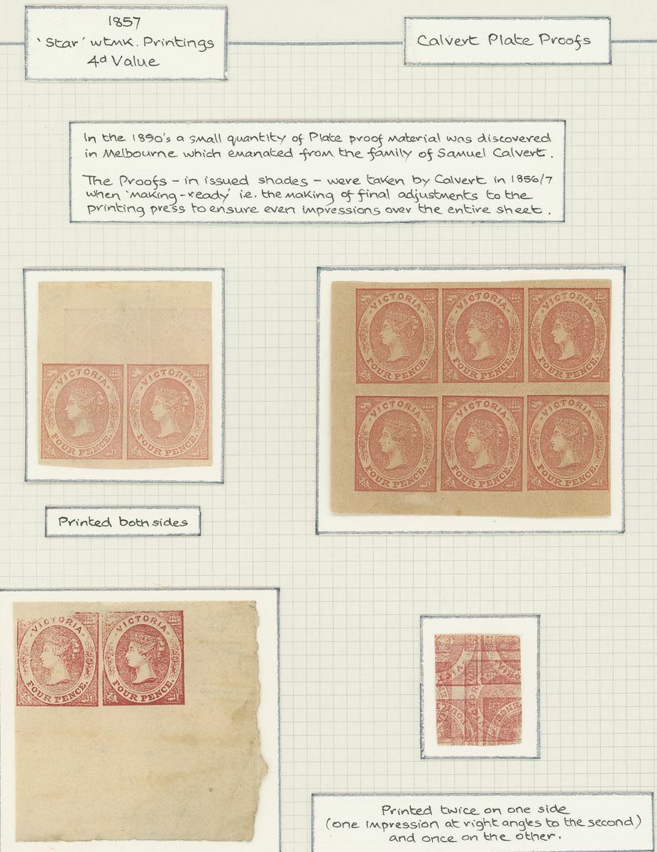 1857 imperforate plate proofs comprising 4d. rose-red lower left corner block of six (3x2) and a top marginal pair printed both sides, 4d. dull rose lower right corner pair and a single printed twice on one side with one impression at right angles to the second, fine
