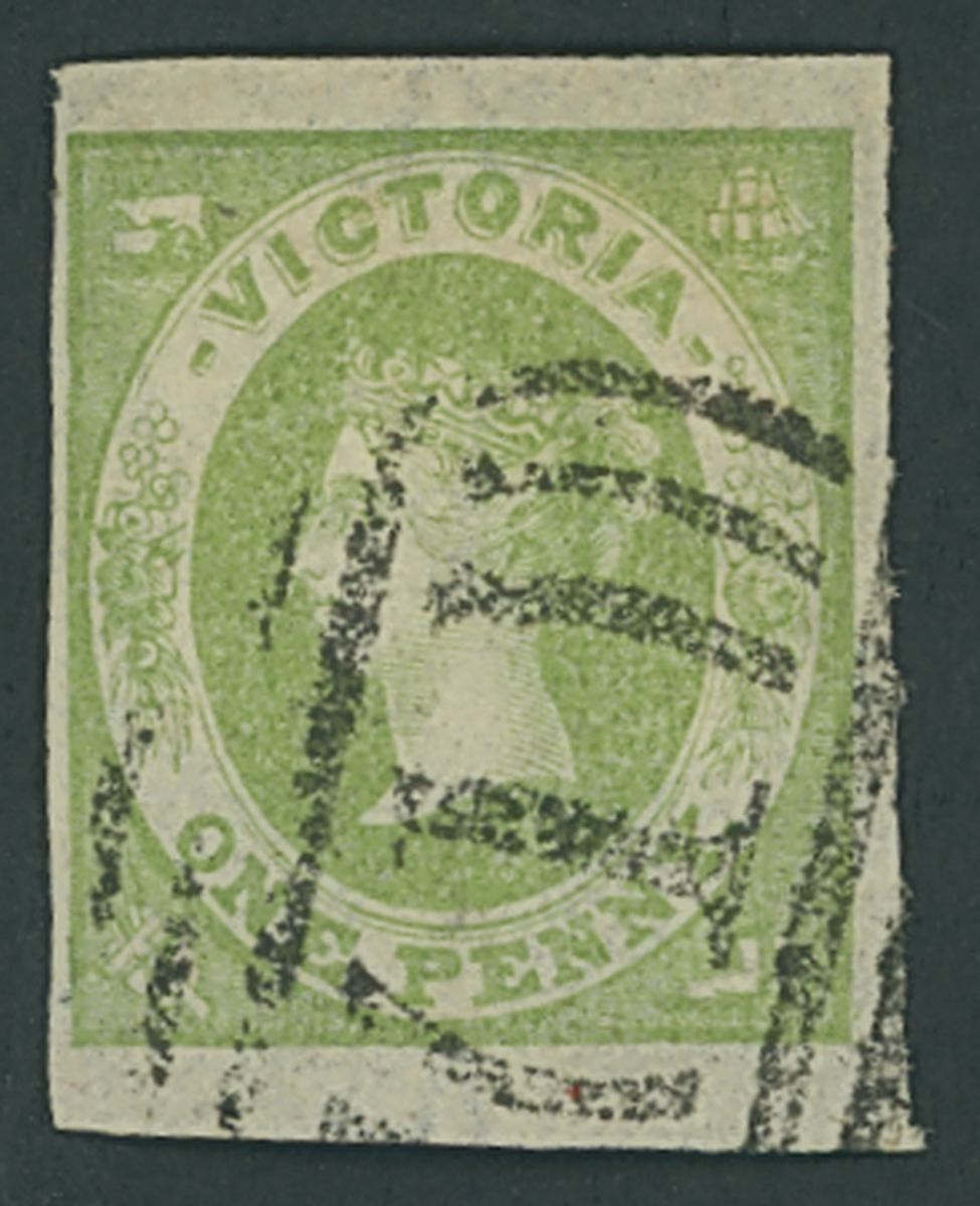 1857 (Aug. - Sept.) Calvert, watermark Large Star, rouletted 7-9 1d. yellow-green with roulettes on three sides and cancelled with Barred Numeral "1", fine. Scarce and much under-catalogued. S.G. 46