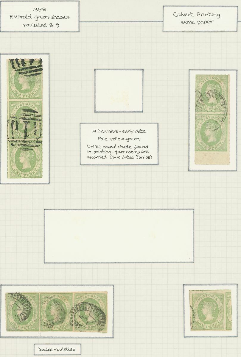 1858 (Jan. - Apr.) Calvert, no watermark, rouletted 8-9 on all four sides, 1d. emerald-green horizontal and vertical strips of three, vertical pair with sheet margin at foot and a single with large part of adjoining stamp at right, fine. S.G. 62a