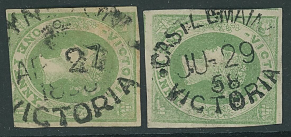 1858 (Jan. - Apr.) Calvert, no watermark, imperforate, 1d. emerald-green group, two singles, one cancelled by large part oval