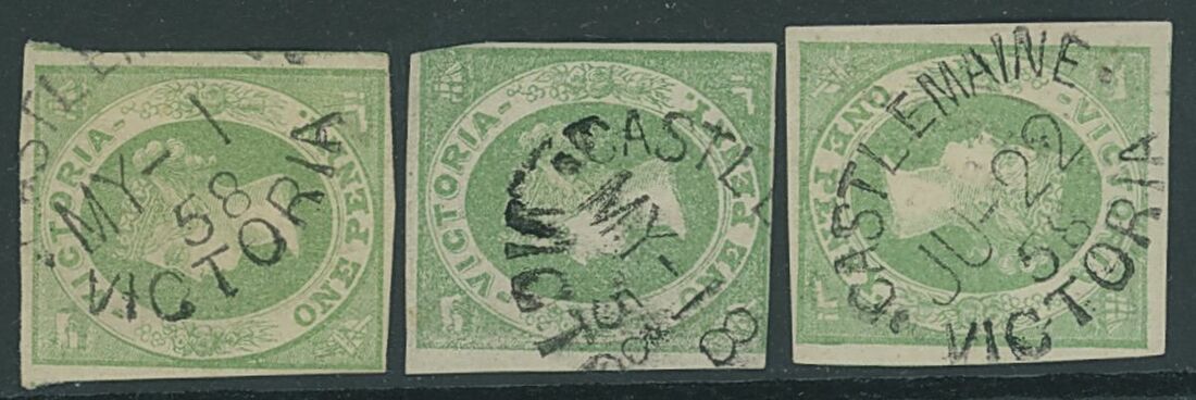 1858 (Jan. - Apr.) Calvert, no watermark, imperforate 1d. emerald-green group, three examples each cancelled by large part or virtually complete oval