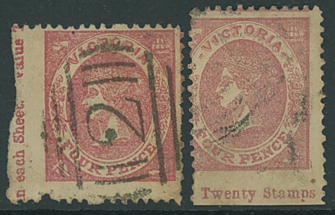 1859 (17 May - 23 Dec.) Robinson, No Watermark, Perf. 12 on good quality wove paper, 4d. dull rose (2), one with part margin at left, the other (a "narrow" example) with part margin at foot, both showing part inscription, fine used. Rare. S.G. 83