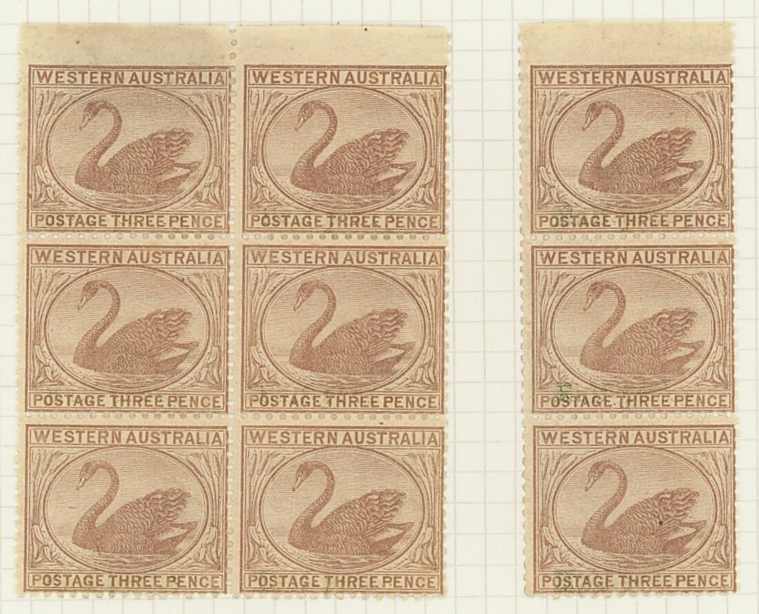 1895 (Nov.) "Half-penny" on 3d. block of six (2x3) and a vertical strip of three with light or traces of surcharge though clearly showing impressions on the reverse, fine mint