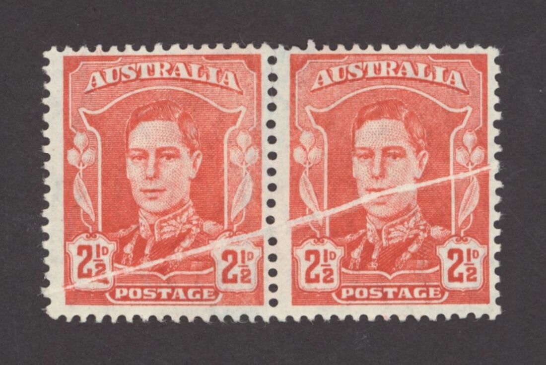 1942-50 2½d. scarlet, horizontal pair with dramatic pre-printing paper fold resulting in a visually striking error; full original gum. S.G. 206 var.