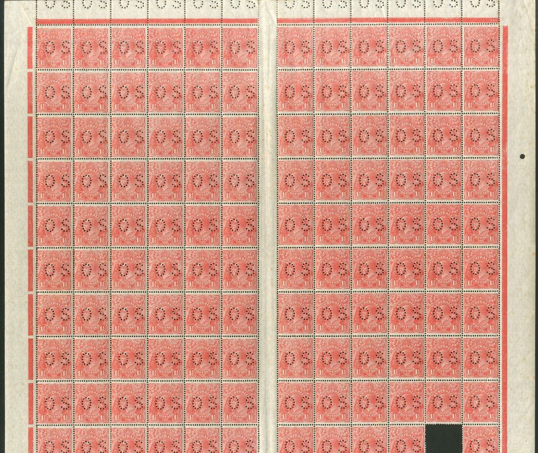 1926-30 1½d. scarlet, sheet of 120, two panes of sixty (6x10, one stamp removed), unmounted mint, some split perfs., tone spots and minor marginal faults; fine. Rare. S.G. O90, £5,355