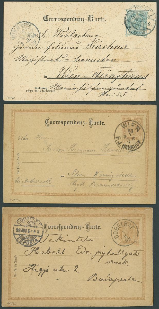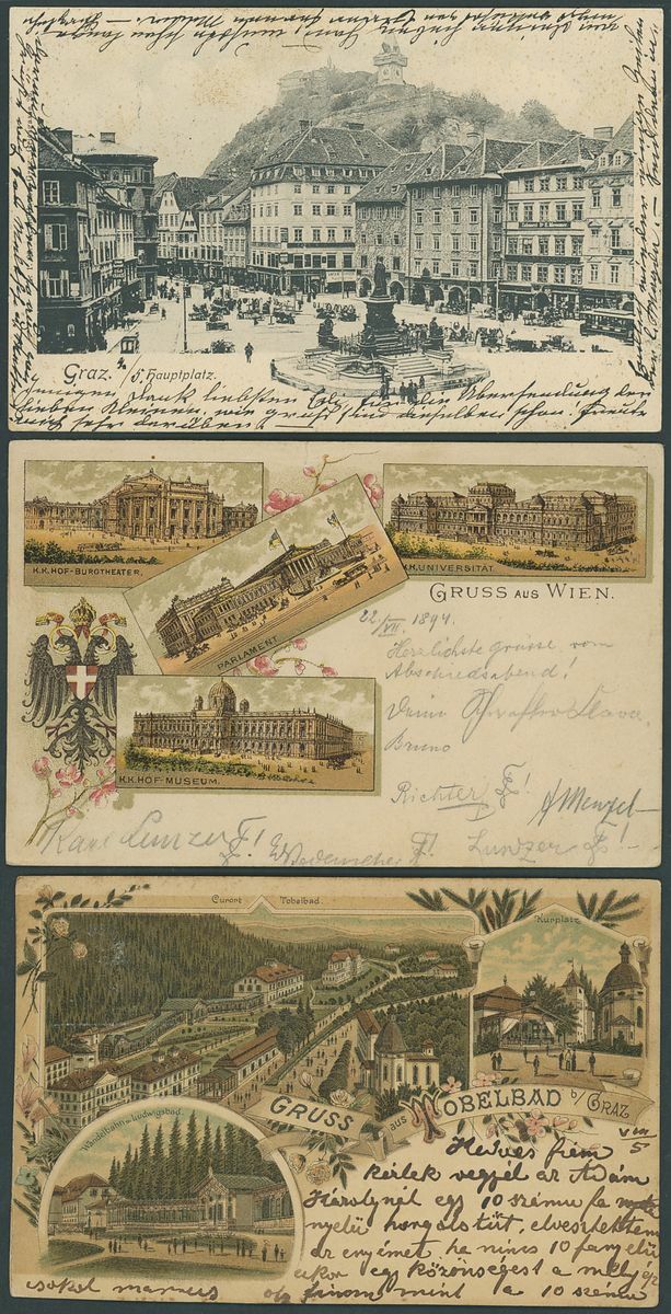 1894 and 1898 2k. private coloured picture postcards (Grus aus Wien and Obelbad), 1904 5h. private picture postcard (Graz-Hauptplatz); a few tiny corner creases or stains