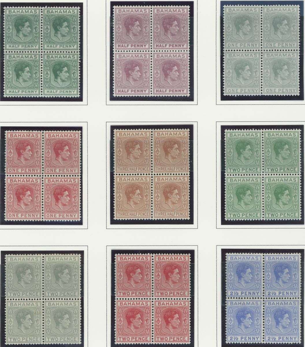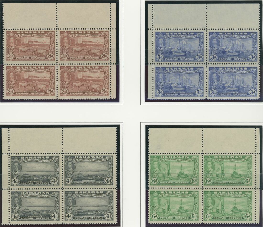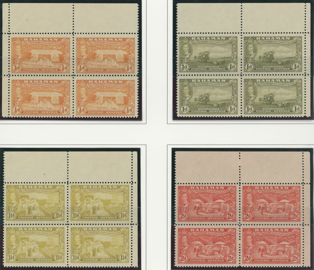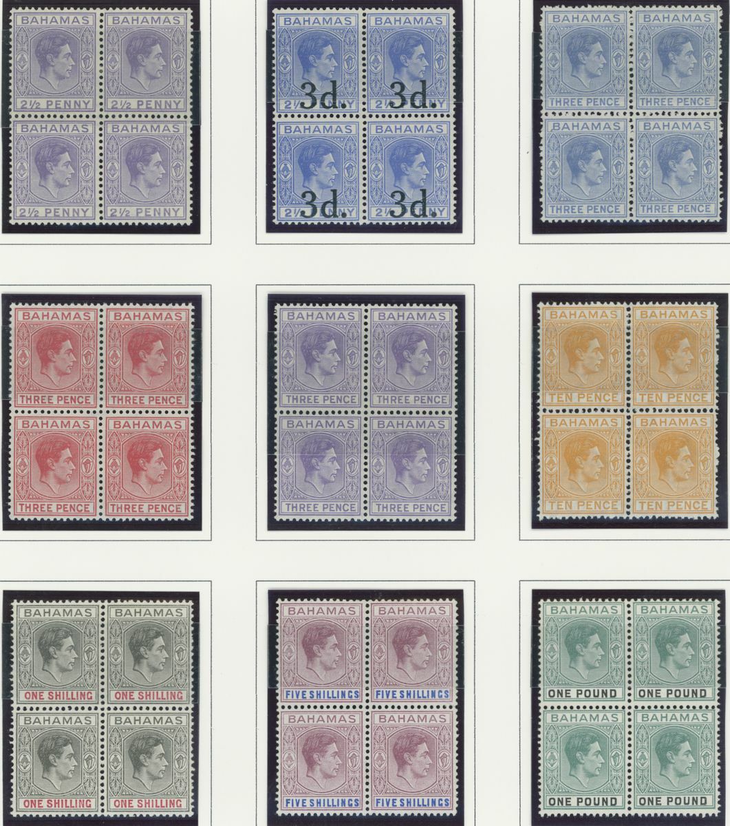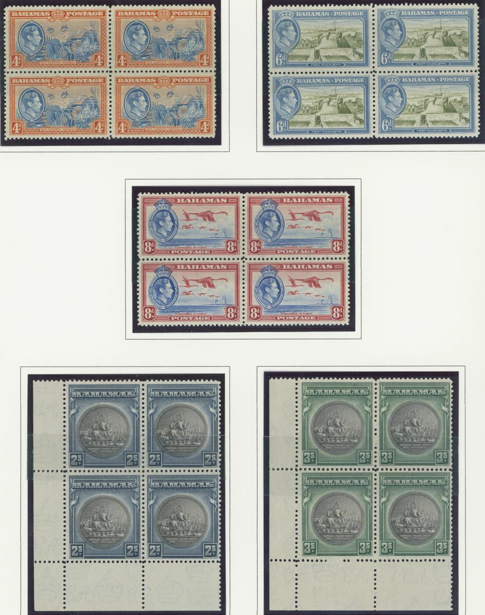 1938-48 mint group of blocks of four comprising 1946 2/- and 3/-,  1938 set of eighteen including 1940 3d. on 2½d. blue, 1938 4d., 6d. and 8d. and 1948 Tercentenary set of sixteen to £1; all fine unmounted mint. S.G. cat. value £1,000+
