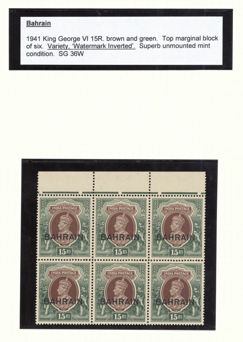 1941 15r. brown and green, watermark inverted, a block of six from the top of the sheet; unmounted mint, an attractive multiple. S.G. 36w, £540+