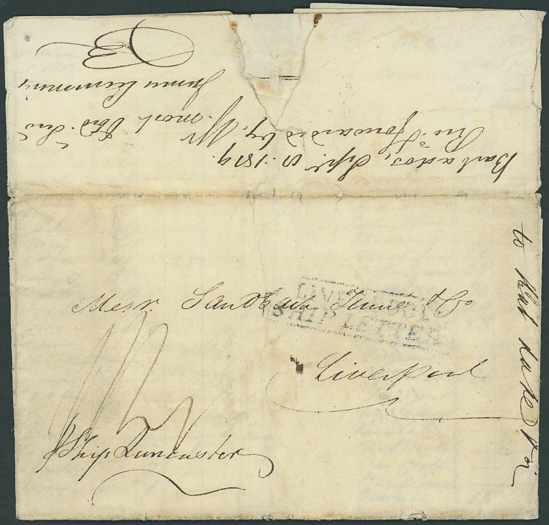 1819 (3 Sept.) entire letter from Demerara "p Ship Duncaster" to Liverpool and showing, on reverse, manuscript "Barbados, Sept  ?? 1819 Recd. & forwarded by yr. most obed Serv. James Cumming", the face panel rated "1/2" and with step-type "